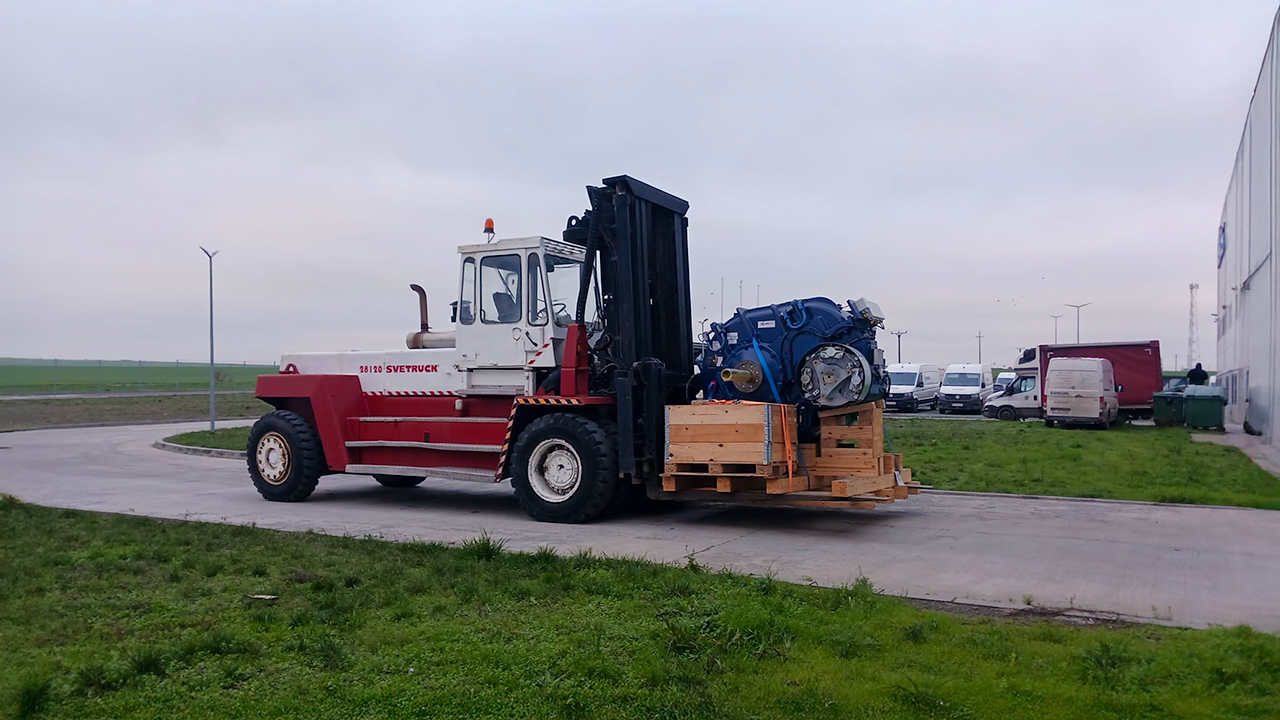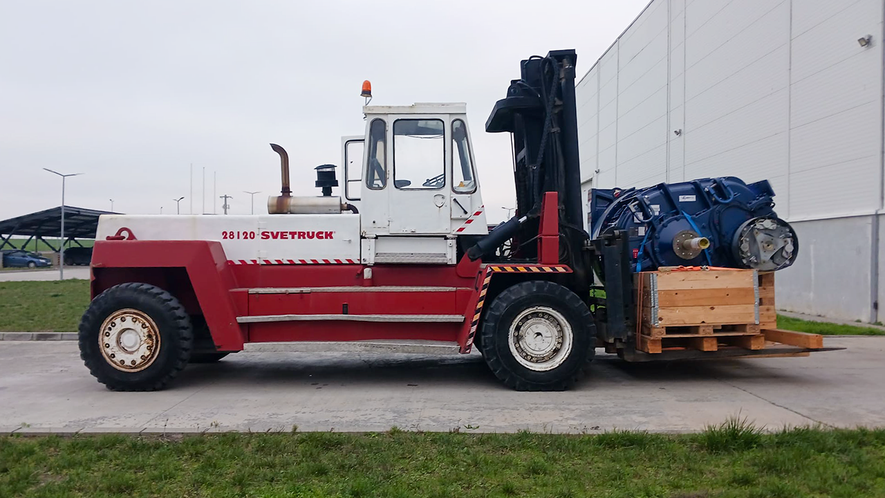 Kran provided heavy-duty material handling support using a Svetruck 28120-46 industrial forklift for the safe transport and positioning of a large mechanical assembly at an industrial facility in Mihail Kogălniceanu, Constanța.